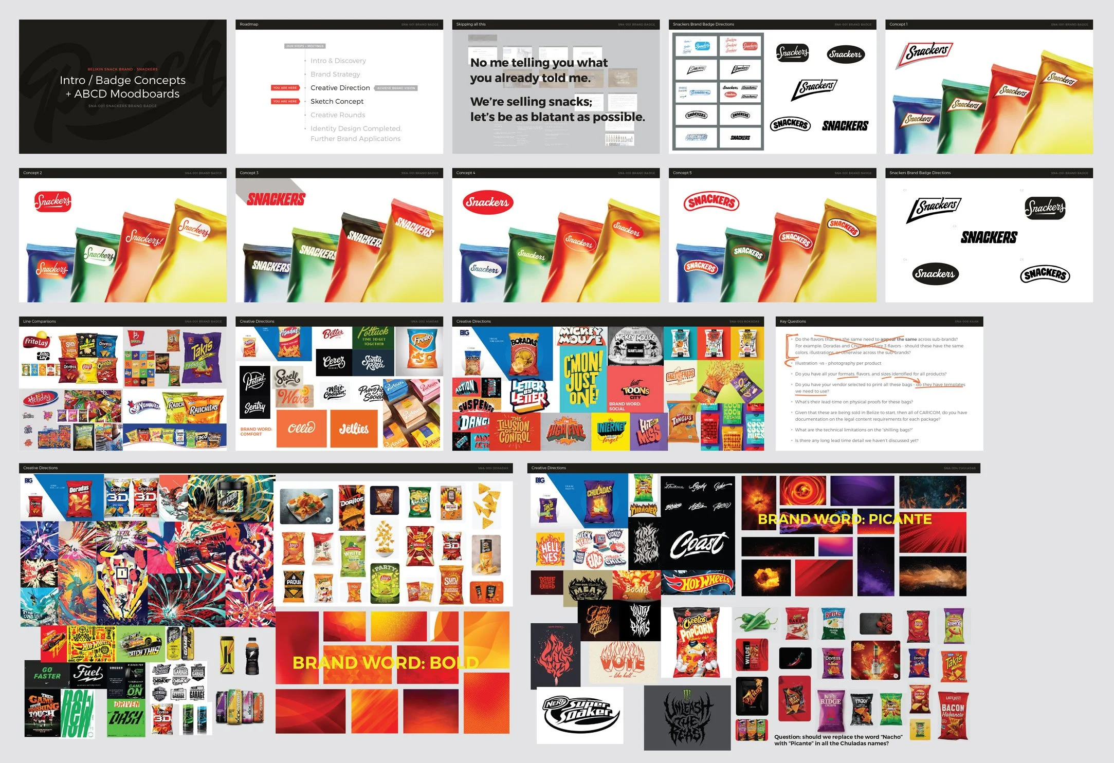 We developed the mother brand for Snackers! as the system that would hold every product in this snack line together - the red chip/flag with the happy script hangs in the same corner of every product, in the same color, unchanging. But beyond that, things vary widely. As you’ll see below, each line possesses a distinct personality, reflecting the chip’s unique aspects. Asadas - comfort and familiarity / Bokadas: social, party activity / Chiladas: heat and intensity / Doradas: bold flavor profiles / KAAN: inexpensive and accessible / SUNS: natural ingredients and processes